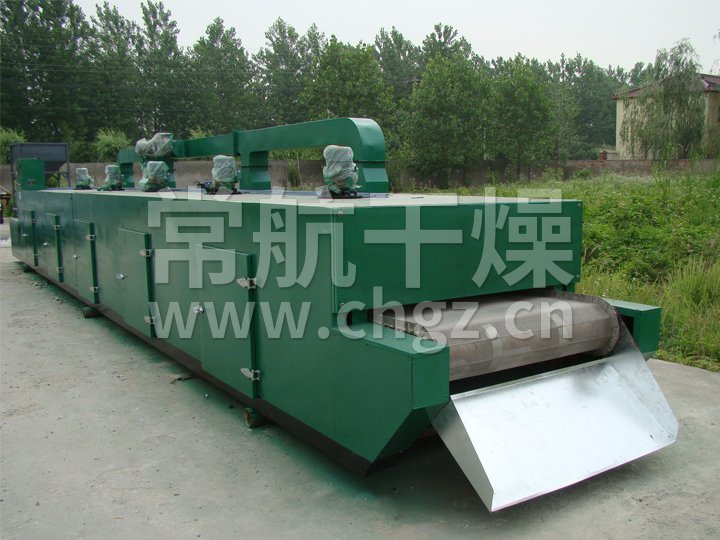 物料由加料器均匀地铺在网带上,网带一般采用12-60目不锈钢丝网,由传动装置拖动在干燥机内移动。干燥机由若干单元组成,每一单元热风独立循环,部分尾气由专门排湿风机排出,废气由调节阀控制,热气由下往上或由上往下穿过铺满物料的网带完成热量与质量传递的进程,带走物料水份。网带缓慢移动,运行速度可根据物料温度自由调节,干燥后的成品连续落入收料器中。上下循环单元根据用户需要可灵活配备,单元数量亦可根据需要选取。